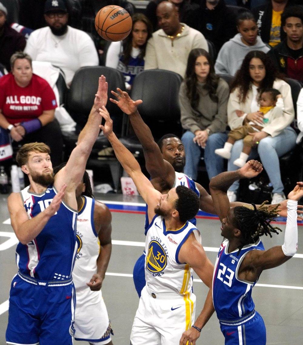 11月28日,勇士队球员克里斯·保罗(前中)在比赛中抢篮板。