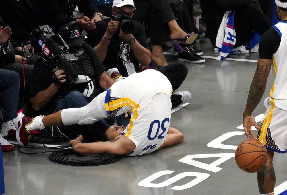 11月28日,勇士队球员库里在比赛中上篮后摔倒。