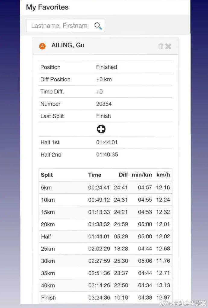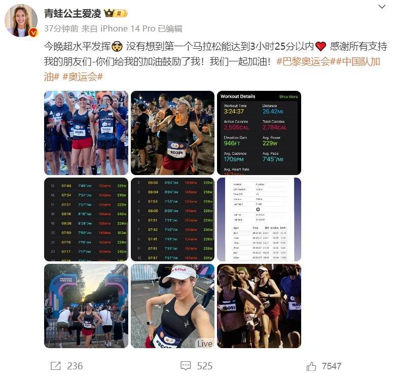 赛后,谷爱凌在社交媒体上表示:“今晚超水平发挥🤯 没有想到第一个马拉松能达到3小时25分以内️ 感谢所有支持我的朋友们-你们给我的加油鼓励了我!我们一起加油!”