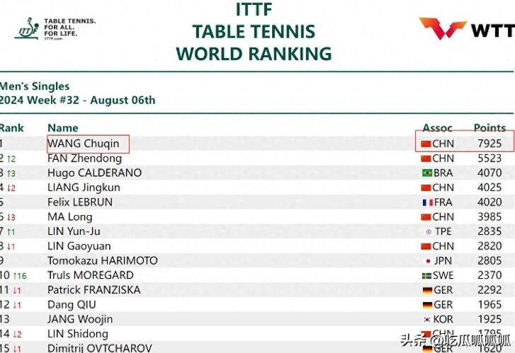 国乒霸榜,实力说话!孙颖莎世界排名第一9000分 樊振东紧随其后