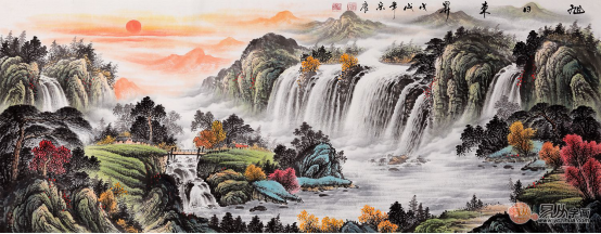 客厅挂什么画合适?《旭日东升》山水顺畅景物多变财运旺,山峰高耸连绵皴擦细致,山顶上植被繁茂郁郁葱葱,同时山间又有白云雾缭绕意境雅致;山间瀑布开阔,中间的瀑布大气而宽广,两侧的小瀑布狭窄而飞流直下,寓意正财来源广阔,又有左右逢源财源不断的美好寓意!