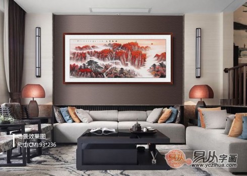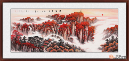 鸿运题材的风水画以红色元素为主,都知道红色在中国代表的是喜庆、吉祥的寓意,运用在山水画中结合灵山秀水则更显美好象征