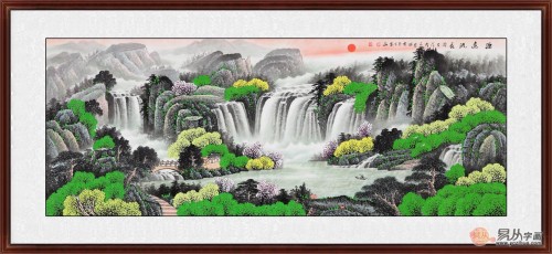风水,风就是元气和场能,水就是流动和变化。水主财,大家都希望财进门,画中的瀑布代表着滚滚涌来的财源,下方一个大的湖泊代表着聚宝盆,财进而不外漏。