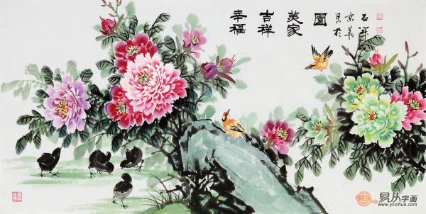 石开八尺横幅牡丹群鸡图《玉露滴翠聚富贵 盛世吉祥幸福家》(作品来源:易从网)
