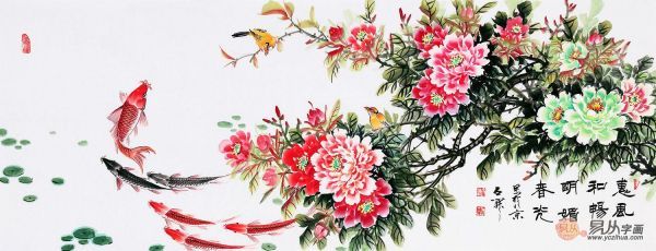 石开牡丹鲤鱼六顺图《惠风和畅 明媚春光》(作品来源:易从网)