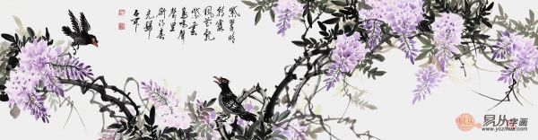紫藤,是国画题材中一种吉祥之物,寓紫气东来、紫光祥兆等。石开老师的紫藤图佳作,绘紫藤花在温暖的春日竞相开放,一簇簇轻盈妩媚,摇曳生姿,两只雀鸟相伴,更为画面增添生机。整幅画面动静结合、情景交融,密叶隐歌鸟,香风留美人,营造一幅繁荣祥和的国画作品,寓意紫气东来,是祥瑞的征兆,送给搬新家的朋友吉祥、美好。
