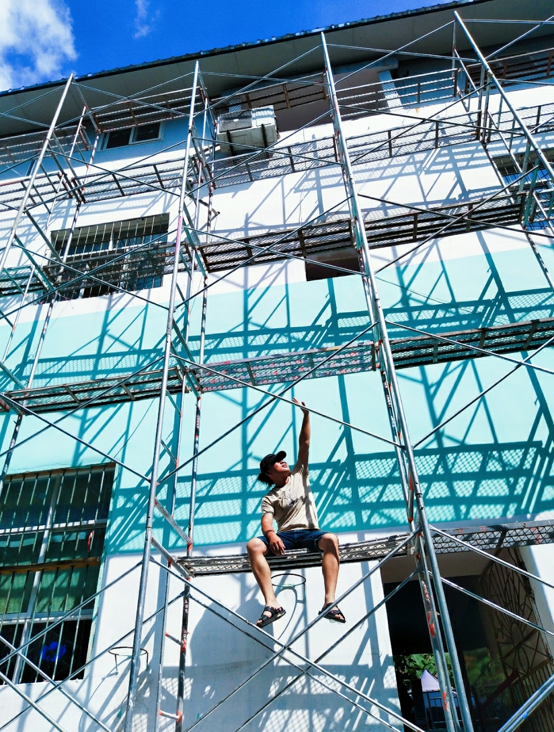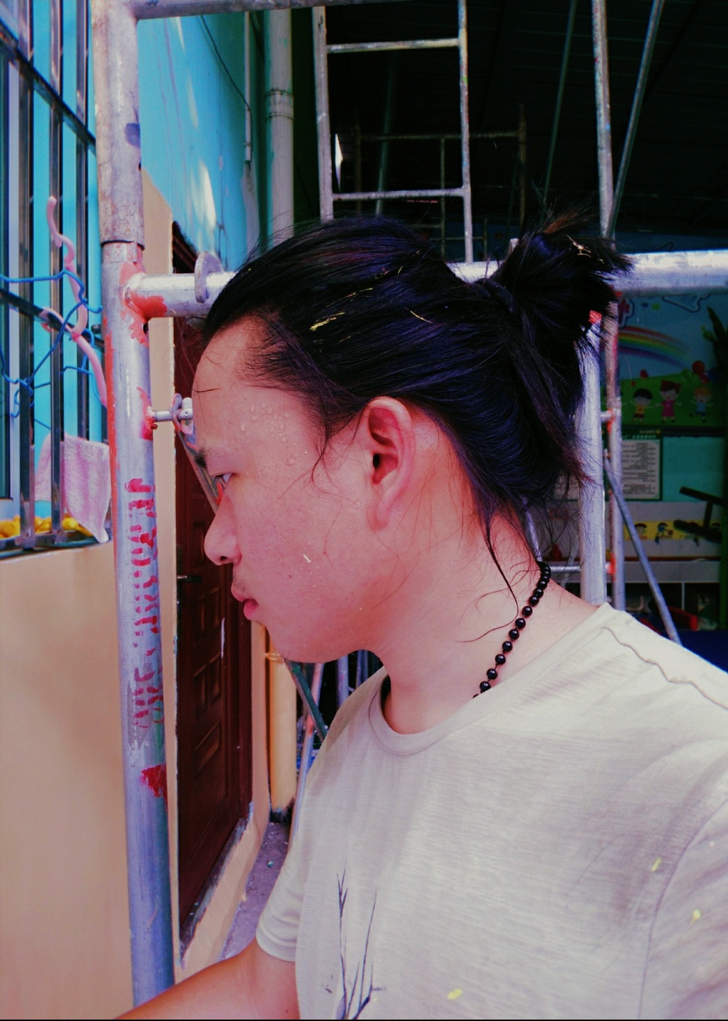 2019年7月,重庆这个夏天,天气格外的炎热,温度高达40℃度,平均也在37℃以上,这个气候大家恐怕大多都躲在空调房里不舍得出来,而这位不走寻常路的画家驱车千里,来到这座被称为“火炉”的城市,帮彩绘公司画起了幼儿园、文化墙,还参与长江师范学院组织的“三下乡”公益活动,美丽乡村壁画绘制。