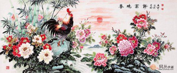 石开八尺国画牡丹群鸡图《玉露滴翠聚富贵 盛世吉祥幸福家》作品来源:易从网