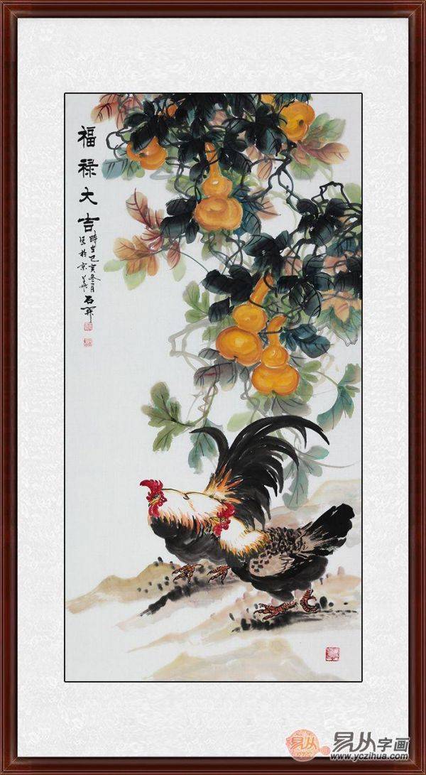葫芦,自古在国人心中就是招财纳福的吉祥之物,五个葫芦,称之为“五福临门”。此幅石开老师的《福禄大吉》图,不仅有黄灿灿的葫芦,还有吉祥的大公鸡,更添了一层“大吉大利”的内涵,二者完美结合,可不是福禄大吉!