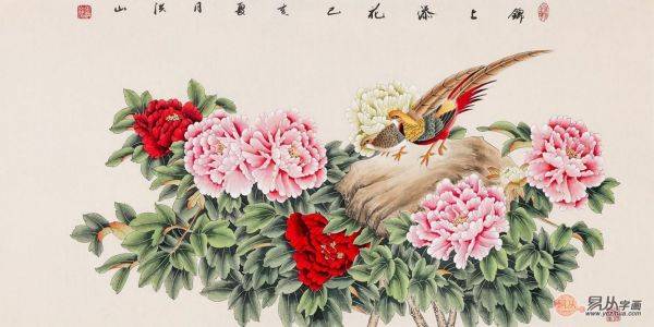 在传统的国画里,以牡丹入画已经不是新鲜题材,而每一个艺术家对牡丹都有着不同的画法和诠释。画家张洪山的这幅《锦上添花》,用色绚丽,笔墨细腻,把牡丹与锦鸡的形象描绘得风姿不俗,浑然天成。牡丹是富贵花,成对锦鸡落在牡丹丛中,谐音“锦上添花、前程似锦”,寄托着人们对家庭富裕、富足安康的生活期盼。