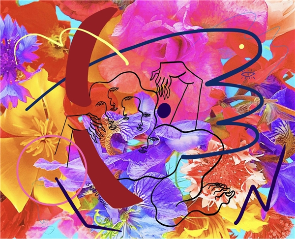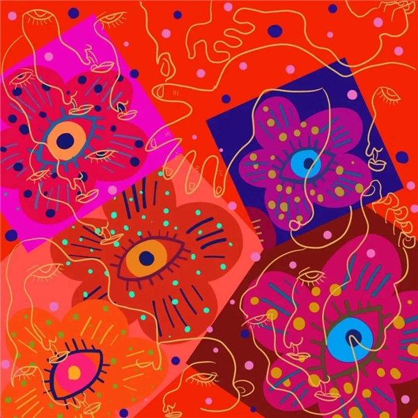 三土的画作里标志性的符号便是眼睛、人脸与花。色彩浓艳的红色花朵中间,一只眼睛漠然地看着你,白色花朵由若干个人脸构成,怪异,大胆,且美。