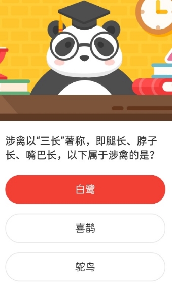 涉禽以“三长”著称,即腿长、脖长、嘴巴长,以下属于涉禽的是?这是森林驿站2020年7月11日森林小课堂的问题,该问题给了白鹭、喜鹊、鸵鸟三个选项,大家知道哪一个是正确答案吗?不清楚的朋友,下面小编为大家带来了2020年森林驿站7月11日森林小课堂答案,一起来看看吧。