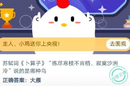 今天的问题是:苏轼词《卜算子》“拣尽寒枝不肯栖,寂寞沙洲冷”说的是哪种鸟?