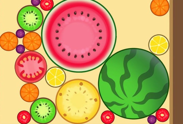 水果按等级从低往高为:有葡萄、山竹、橙子、柠檬、猕猴桃、西红柿、桃子、杨桃、椰子、半个西瓜、整个西瓜,合成一整个西瓜算是达成基础目标。