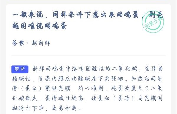 鸡蛋是一种营养价值很高的食物,很多人都会每天食用一个以上的鸡蛋,但有时候鸡蛋壳容易剥,有时却很难拨下来,今天蚂蚁庄园就是问大家一般来说,同等条件下煮出来的鸡蛋,剥壳越困难说明鸡蛋是越新鲜还是放置时间越久?一起来看看答案吧。
