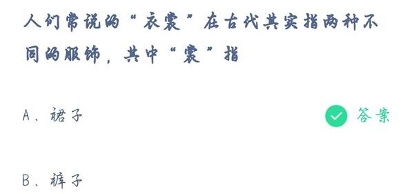 原标题:蚂蚁庄园5月5日答案 人们常说的衣裳在古代其实指两种不同的服饰,其中裳指 衣裳是古代人的常见服饰名称,今天蚂蚁庄园小课堂的问题就与衣裳相关,人们常说的“衣裳”在古代其实指两种不同的服饰,其中“裳”指裙子还是裤子?一起来看看答案吧。