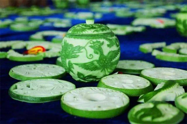 靖州蜜饯,古代中国雕花食品的一种。历史悠久,是妇女们巧夺天宫的技巧制作。靖州蜜饯是将未成熟的柚子青果切成片,用柳叶刀雕出龙、凤、鱼、虾、花、鸟、虫、叶以及“喜鹊闹梅”、“孔雀开屏”、“燕子啄泥”、“二龙戏珠”、“嫦娥奔月”、“鱼儿戏水”等一些图案,放在水中漂洗,然后拌白糖或蜂蜜,晒干即成。