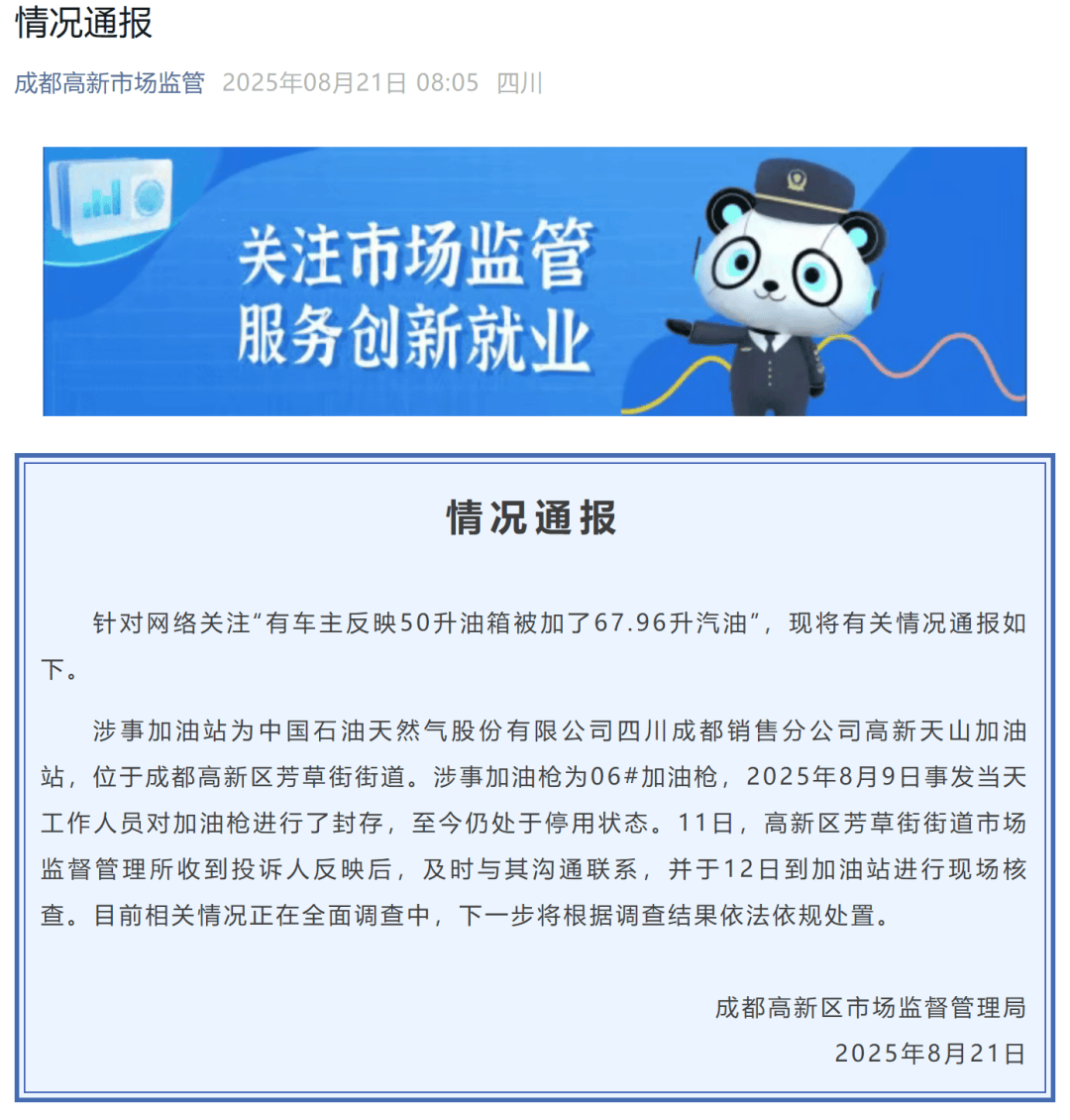 原标题:成都加油站50升油箱加67.96升汽油事件 官方通报