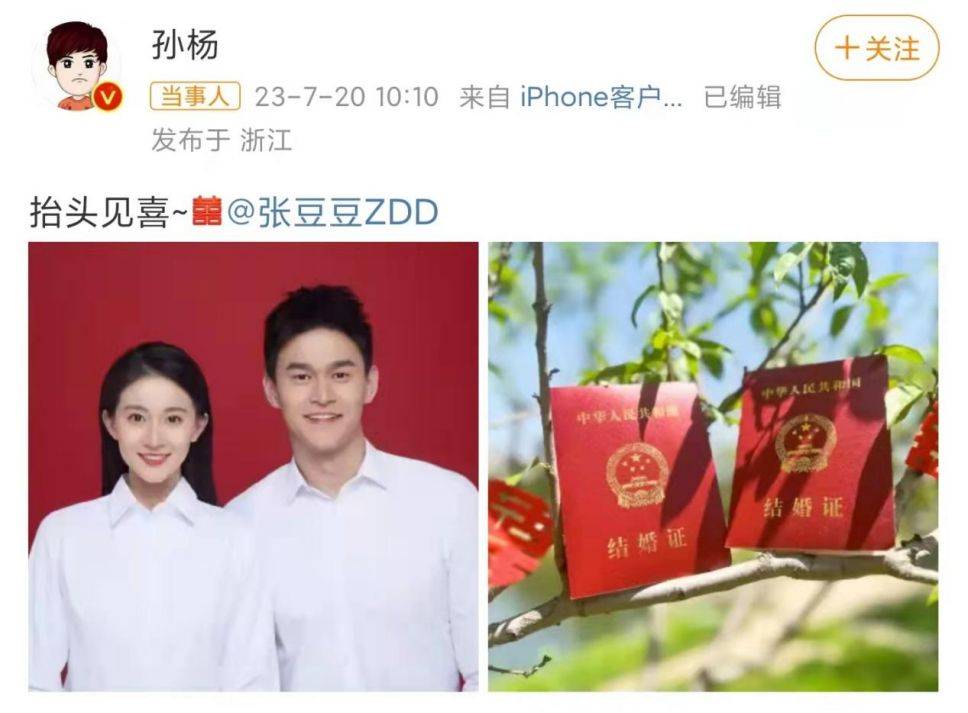 20日,孙杨晒出结婚证与结婚照,官宣与张豆豆结婚。