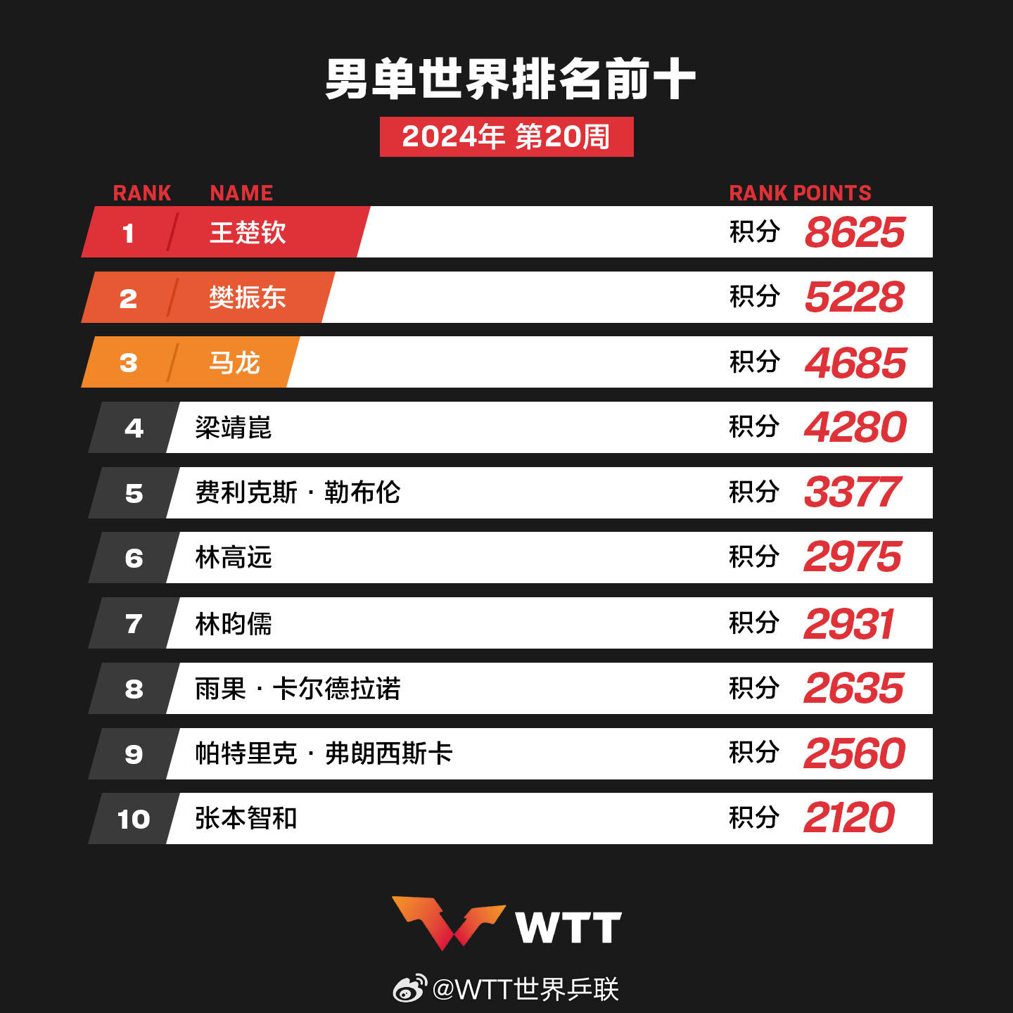 最新:王楚钦孙颖莎世界排名分列第一