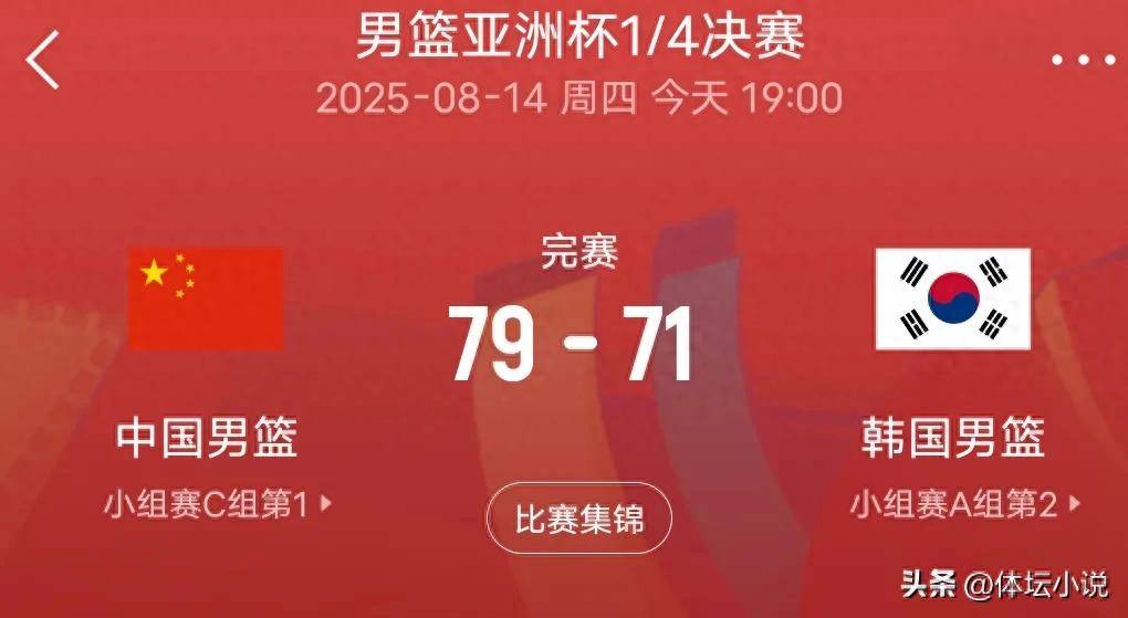 比赛一开始,双方便上演了精彩的对攻战,攻势频频,一来一往争比分。首节战罢,中国男篮以微弱的优势25-24领先。进入第二节,凭借铁血的防守,中国男篮限制了韩国队的进攻,单节打出21-11的佳绩,半场结束时领先11分。下半场角逐再度展开,双方交替得分,分差在10分左右波动,第三节结束时中国队仍领先9分。末节中,中国男篮稳守领先,不给韩国男篮缩小分差的机会。廖三宁的精准三分如同利刃般杀死比赛悬念,最终,中国队以79-71的比分取得胜利,成功晋级四强。这是中国男篮时隔十年再次跻身亚洲杯四强,完全达成比赛目标!