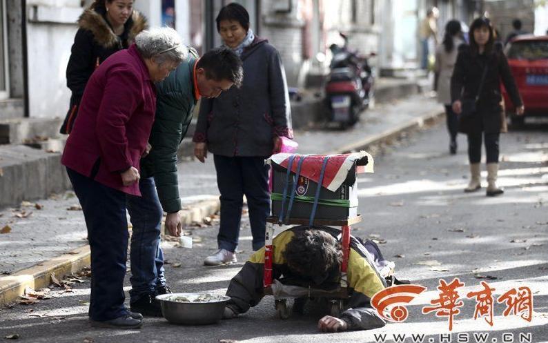 77岁芮和喜老人询问“残疾”乞丐是否需要帮助,路人不断向他施舍钱财。