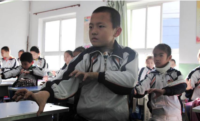 12月11日,河北石家庄光明路小学,全校的孩子都在教室练习一套“防霾”武术健身操。进入冬季,北京、天津、河北、上海等国内多地频现雾霾天气。为了减少霾对孩子的伤害,该小学独创了这套防霾健身操,可增强孩子体质。