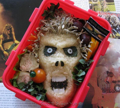 但是,也有人撇开可爱、精美等特点,制作出“恐怖”的角色便当,让人不敢下口。这些便当中使用的形象包括骷髅、张开血盆大口的恶鬼等;有些则在眼睛等个别部位,或者色彩搭配方面作文章,力求足够的震撼感。