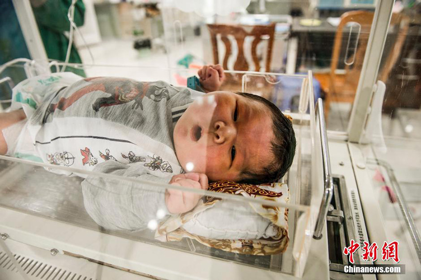 2月12日,出生时体重达14.24斤的新生儿“小胖”正在汕尾市人民医院儿科的保温箱中接受监护。2月7日,汕尾居民黎女士通过剖腹产生下一14.24斤男婴,医生们都亲切地叫这个胖乎乎的婴儿“小胖”。据《吉尼斯世界纪录大全》记载,世界上体重最重的新生儿是1955年出生的一名意大利婴儿,当时他的体重为20.4斤。