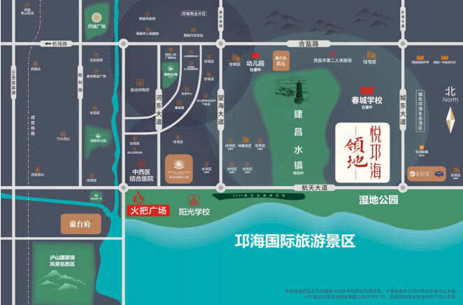 领地·悦邛海位于西昌东城贵脉,南侧紧临航天大道东延线及中国内陆最大的城市湿地公园,西北面毗邻政府重金打造的400亩建昌水镇公园,加之邛海的自然资源,景观视野西昌无双。悦邛海四周全无遮挡,推窗即见的山海阔境,带来丰盛的天然享受,自在的栖居生活悦享至极。