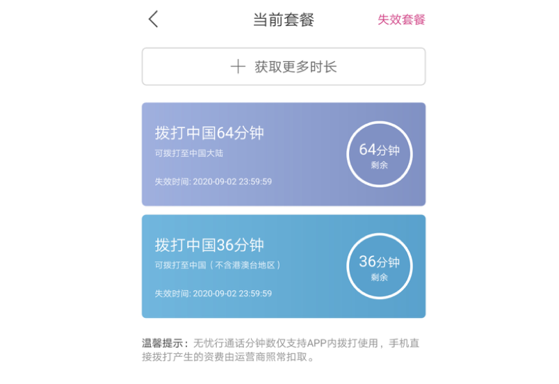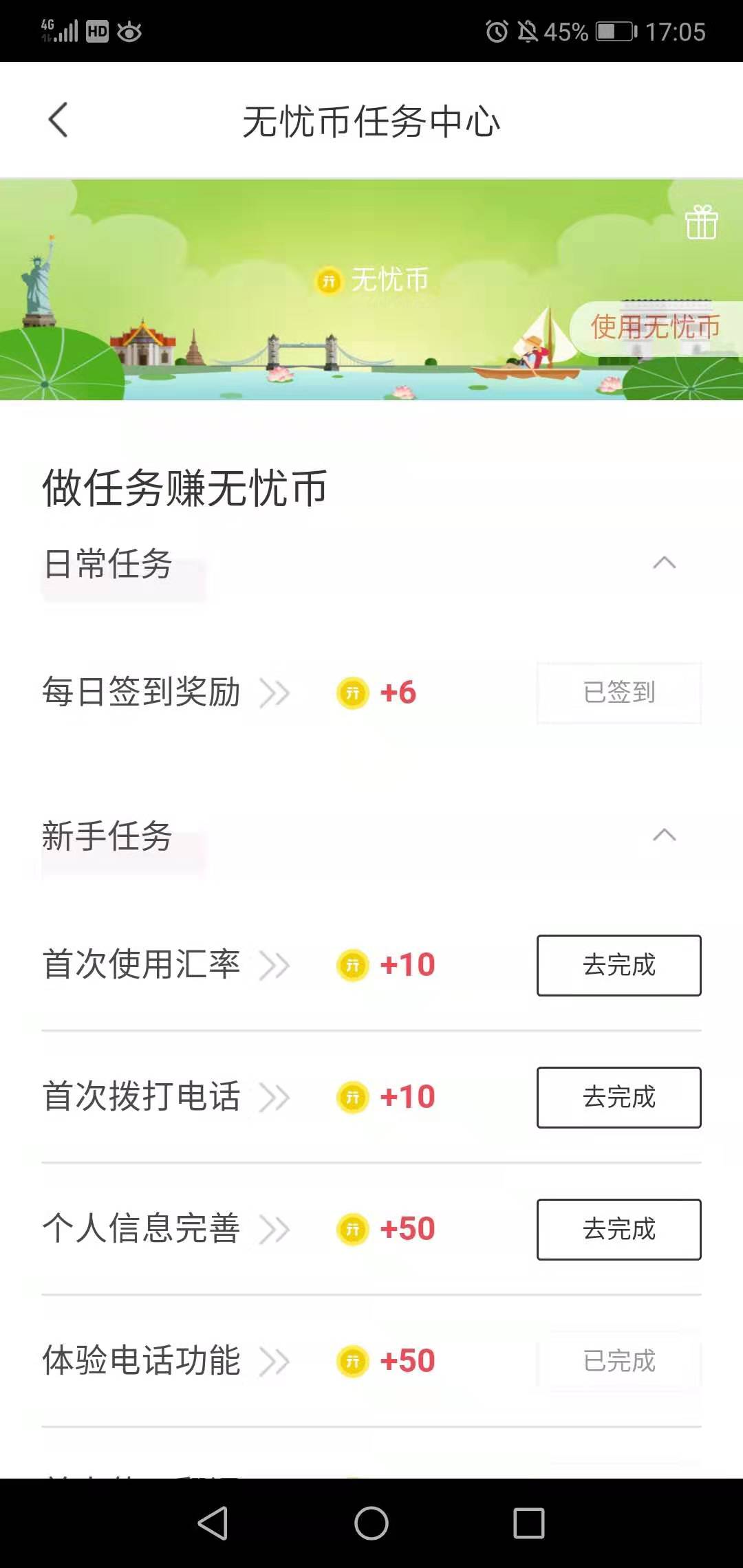 只需上面简单两步,就可以成功在国外拨打免费长途国际电话回国啦。如果时长用完了也不用慌,可以通过无忧币兑换更多通话时长。