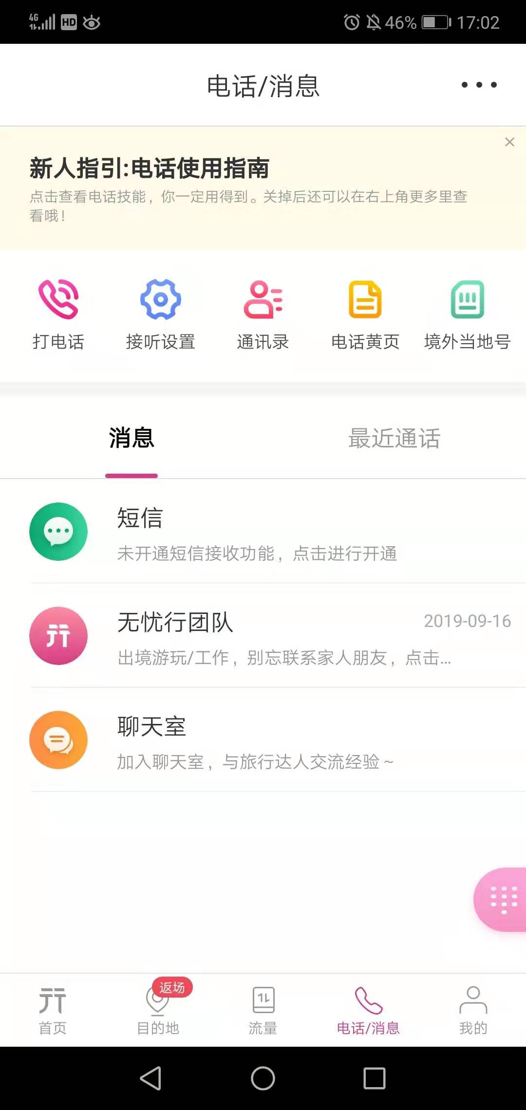 进入无忧行APP首页“电话”页面即可拨打电话,可以在“通讯录”选择联系人拨打,也可以直接在拨号盘输入号码拨打。“电话黄页”里还有很多实用的公共号码,可以帮你省去找电话号码的麻烦。需要注意的是,这个时长仅限于在境外时使用。