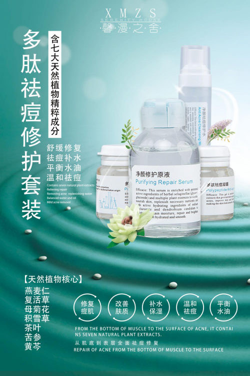 本期节目中将会提到的馨漫之舍多肽祛痘套装,克散痘源、修护、补水嫩肤。七大天然植物精萃成分,从肌肤到表面,全面祛痘修复。
