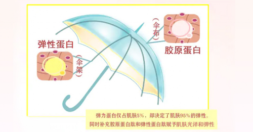 胶原蛋白就是伞面,弹性蛋白就是伞骨。所以,为什么很多女性在用了那么多的胶原蛋白产品之后效果不大,就是因为没有弹性蛋白的补充。如果肌肤没有弹性蛋白提供的弹力,胶原蛋白再足,也没有办法保持健康不松弛。