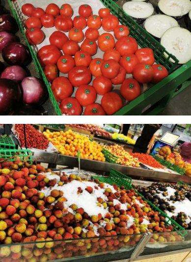 一进入超市,就是排列得非常整齐的水果和蔬菜柜台。这些蔬果不但颜色漂亮好看,而且表皮水润,大小一致,好像是用尺子量过似的。乍一看,仿佛看到很多制作精美的展览品。有些容易磕碰的蔬菜放在玻璃柜里,避免了顾客们的挑挑拣拣产生的二次污染,设计的非常科学。