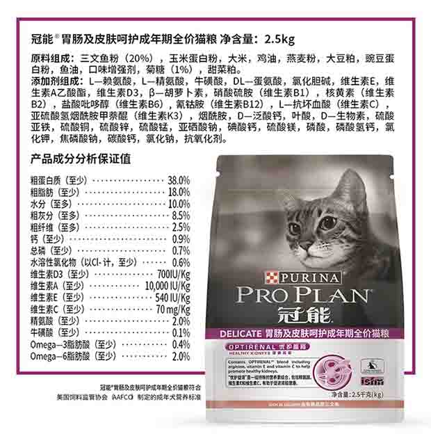 我在查看了多个品牌后,最终决定给“毛孩”买---冠能肠胃及皮肤敏感猫粮。它主要的蛋白质来源是三文鱼,在补充营养的同时不刺激猫咪的肠胃和皮肤。除此之外,这款猫粮里还含有维生素C和维生素E成分,可以起到增强免疫力的作用。