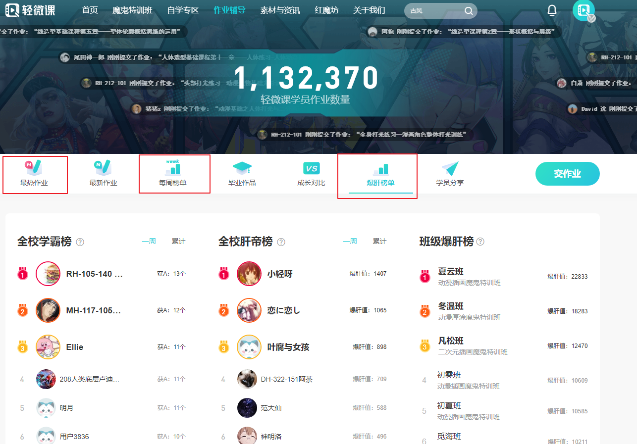 在轻微课作业区,有百万份以上学生作业量,以及各种榜单排行榜,不只是有个人排行,还有班级排行,把个人与班级的荣誉进行结合,形成学习团队的竞争氛围,这一点做得非常人性,毕竟每个人都有虚荣心,都需要获得认同感。