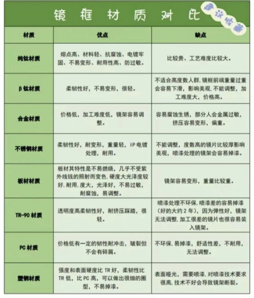 镜框的材质,在一些眼镜方面的分享上看到的他们分享出来的图片总结,大家可以一目了然的查看自己对于材质这方面该怎么选择,来达到自己适合什么材质的镜框。