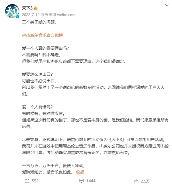 杰威尔发文后,《天下3》立即删除了相关抽奖微博,并发布澄清说明,表达对周杰伦和杰威尔公司的歉意。《天下3》表示,赠送周杰伦数专活动仅为《天下3》日常回馈老用户活动,并未在游戏中使用周杰伦的音乐作品,其初衷在于回馈玩家,愿意为此承担所有后果。