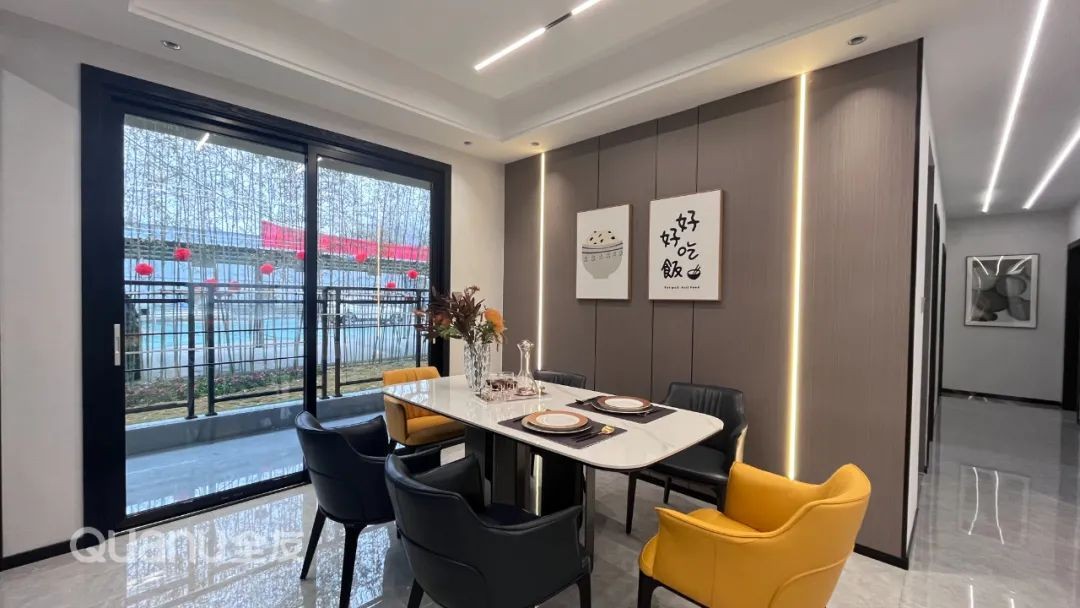 餐厅选用了全友的岩板餐桌,耐磨耐刮,不惧高温易清洁。双色餐椅点亮空间,环抱式靠背有力支撑,倚靠更舒适。