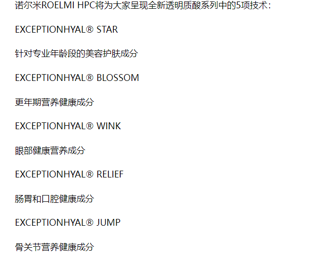 诺尔米ROELMI HPC作为可持续健康原料的研发企业,一直活跃于个人护理与健康领域,公司专注于功能性和活性成分的研发、规划与生产,本届Hi&Fi Asia-China展也将携成功研发的新一代全光谱透明质酸HA Tech 2.0® Hyaluronans亮相展会。