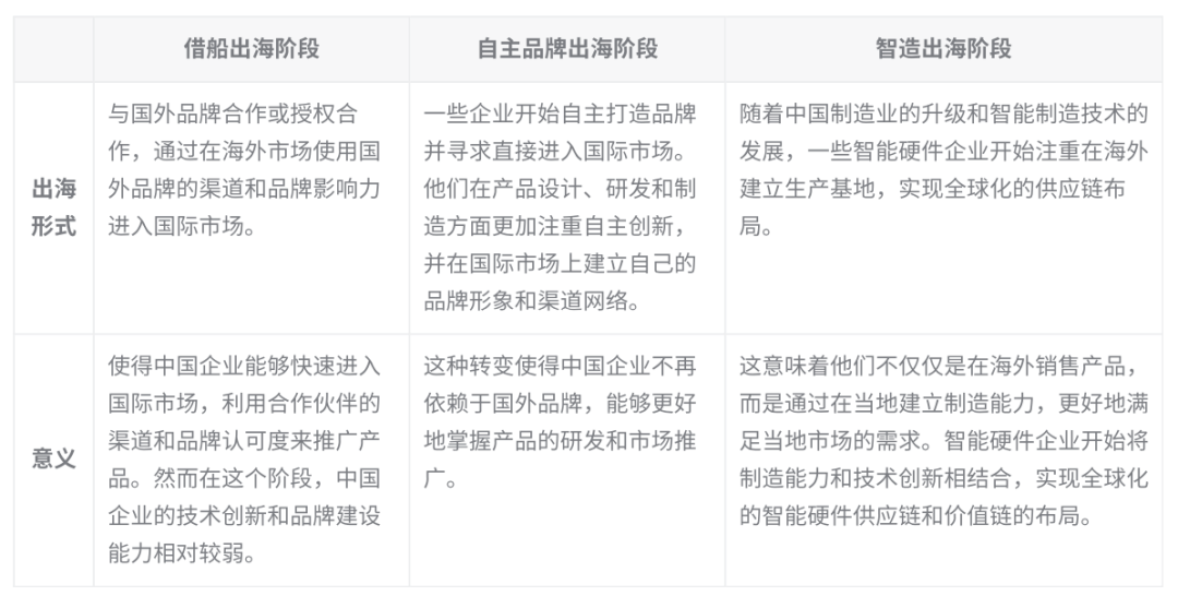 中国智能硬件企业的技术实力、品牌认知度和市场渗透率也在这段时期不断提升,从最初的借船出海,逐渐发展为自主品牌出海,并在智造出海阶段实现了全球化供应链布局。