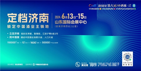 明年6月13日—15日,全新升级后的2024(第八届)中酒展,即将在济南盛大开启,抢抓2024年中大型招商黄金期,深耕酒业主销地,请联系主办方。