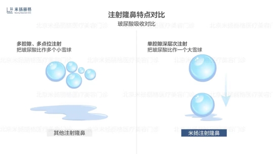 第二,效果方面。以往注射隆鼻,注射层次浅,易透光,注射位置在软组织内腔隙,多点位注射造成不自然,易扩散移位,反而加速透明质酸吸收。采用米扬丽格注射隆鼻技术则只有一个进针点,注射位置在骨膜上层单层次,单腔隙连续性注射,形成“玻尿酸”假体,不易扩散移位、变宽塑形与维持效果更好。