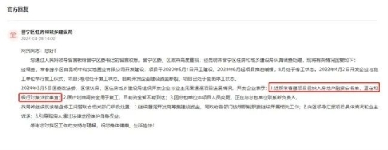 近日,晋宁区住建局回复称,全面停工的实地常春藤近期已纳入房地产 白名单,正在和银行对接贷款事宜。