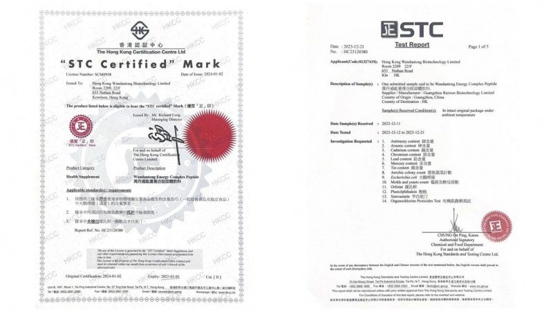 2024年1月2日,万丹通能量复合肽固体饮料获香港标准及鉴定中心(STC)颁发的香港“优质正印”认证证书。